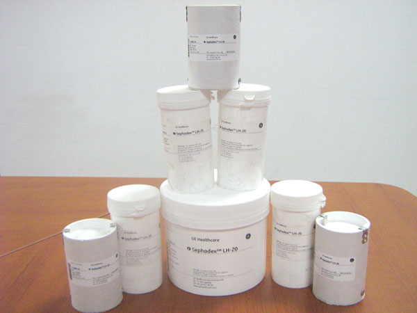 全稱為羥丙基葡聚糖凝膠。Sephadex LH-20為Sephadex G-25(葡聚糖凝膠按交聯(lián)度分類的其中一種商品型號)經(jīng)羥丙基化處理后得到的產(chǎn)物,此時(shí),葡聚糖凝膠分子中的葡萄糖部分將與羥丙基結(jié)合成下列醚鍵形式: -OH → -OCH2CH2CH2OH ,與Sephadex G比較,Sephadex LH-20分子中 -OH 基總數(shù)雖無改變,但碳原子數(shù)所占比例卻相對增加了,所以Sephadex LH-20不僅可在水中應(yīng)用,也可在極性有機(jī)溶劑或他們與水組成的混合溶劑中膨潤使用。