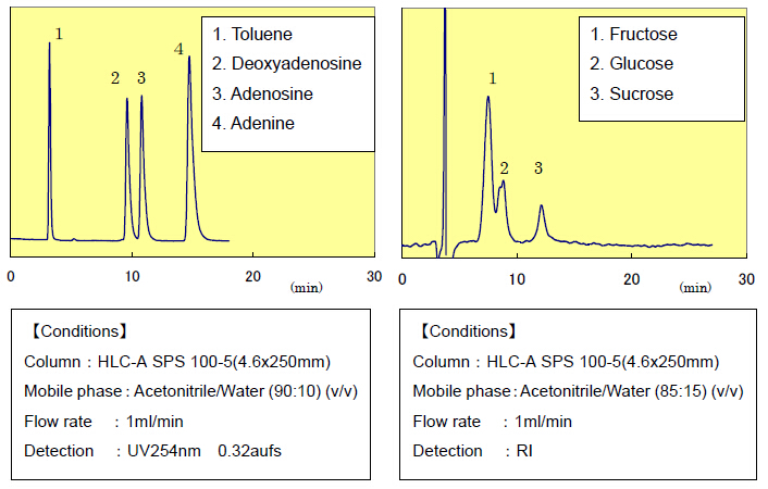 在HILIC模式下,初始流動相條件用的是高比例有機溶劑和水。這種洗脫體系使得單一化合物得到分離,并且之后的處理步驟也相對簡化(旋蒸或者凍干)。洗脫體系中水含量的增加,使得樣品更容易被洗脫出來。因此,在HILIC模式中,與水易混合的有機相體系最為常用,比如乙腈-水體系。以下應用給出了使用HLC-A硅膠,在乙腈-水等度體系中,分析和制備的應用。