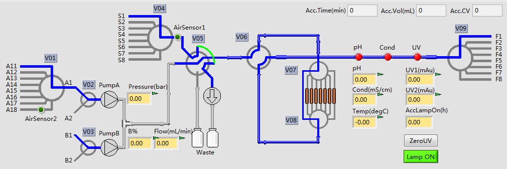 6、全自動(dòng)柱流向切換閥門,可實(shí)現(xiàn)層析柱正、反向流動(dòng)及旁路功能;