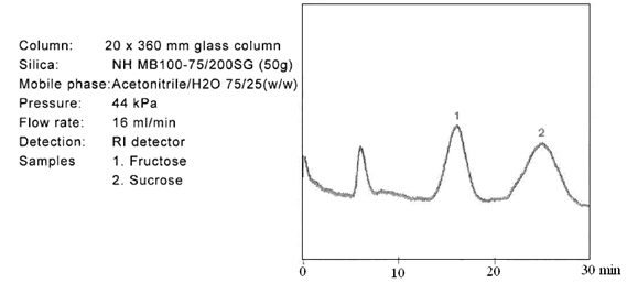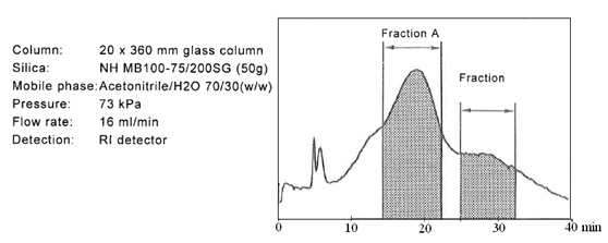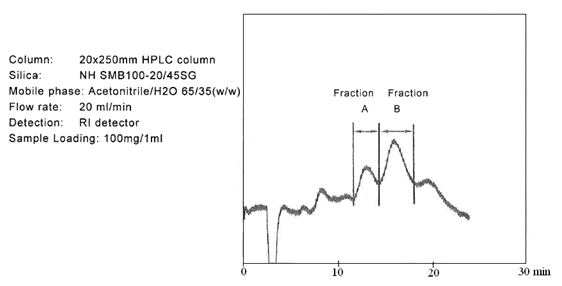 ? ? ? 糖類物質(zhì)的分析和制備,在液相色譜領(lǐng)域占有重要的地位。迄今為止,大多數(shù)的分離介質(zhì)僅僅局限在分析級(jí)別。但是富士硅膠研發(fā)出用于制備色譜的新的氨基硅膠。當(dāng)使用高水相為流動(dòng)相時(shí),一般的氨基填料會(huì)暴露出很多問(wèn)題。氨基硅膠的pH值很高,一般pH為9.0,在這樣高的pH條件下,目標(biāo)化合物一般都會(huì)變性,并且會(huì)毀壞硅膠基質(zhì)的表面。考慮到這些問(wèn)題,富士公司研發(fā)出新的氨基硅膠填料,稱之為NH SG硅膠。NH SG硅膠可以最小化甚至是避免上述問(wèn)題,并且對(duì)糖類化合物進(jìn)行更好的分離。