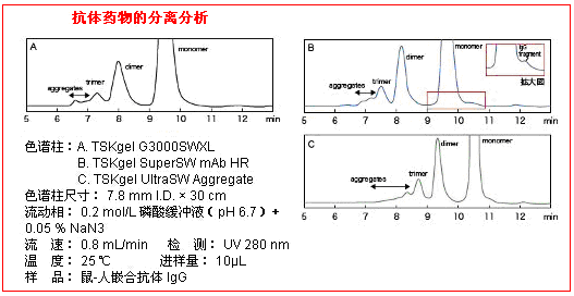 1. 使用粒徑3 μm的硅膠基質(zhì)為填充材料,比G3000SWXL等色譜柱具有更高的分子量排阻限,非常適用于分析抗體藥物中三聚體以上的多聚體等分子量較大的蛋白質(zhì)。