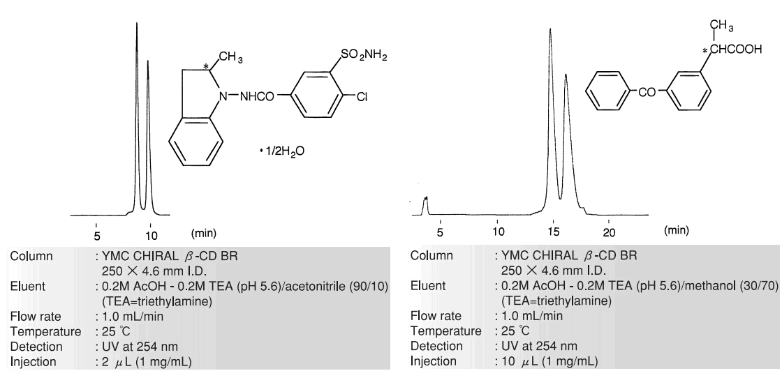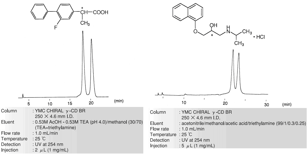 YMC CHIRAL CD BR 系列柱由鍵合有α-溴化環糊精(六環)、β-溴化環糊精(七環)和γ-溴化環糊精(八環)的3種光學異構體的固定相構成。根據3種類型分離模式的不同,擴大了化合物的分離范圍。雙重作用機制,使其與ODS具有不同的選擇性。對ODS分離困難的構造異構的分離有效。