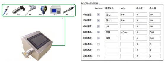 系統(tǒng)提供8路傳感器通道,可接受4~20mA-10V~+10V的信號輸入,可連接絕大部分類型的傳感器,比如:壓力、溫度、流量、電導、pHUV等。