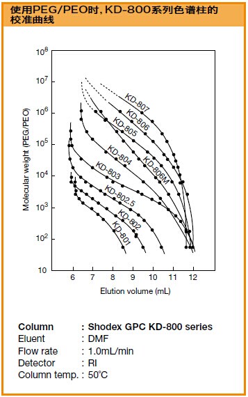 GPC KD-802是標準的油溶性SEC色譜柱,適用于從低分子量到高分子量的寬范圍的樣品。流動相是DMF。