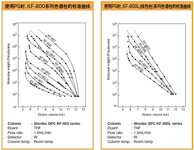 GPC KF-805是標準的油溶性SEC色譜柱,適用于從低分子量到高分子量的寬范圍的樣品。流動相是THF。