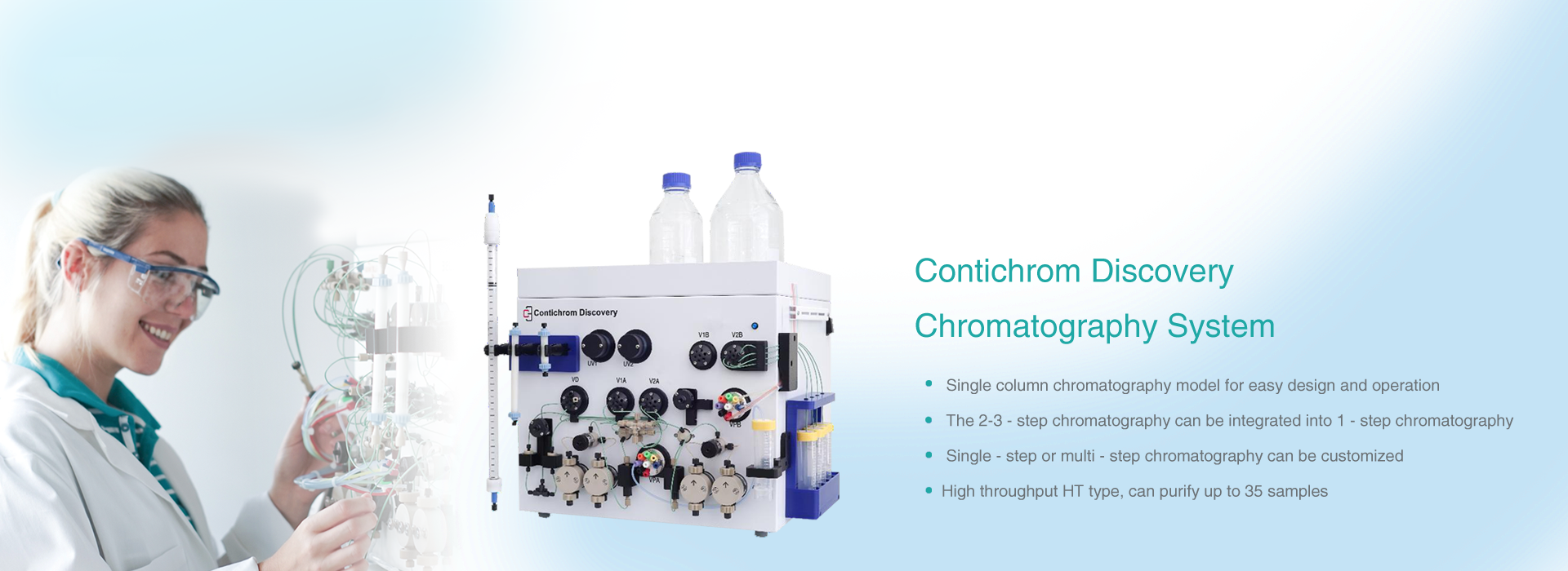 EcoPrime Twin chromatography system is applied to continuous flow purification of production stage, which can realize effective linear amplification of continuous flow chromatography process.